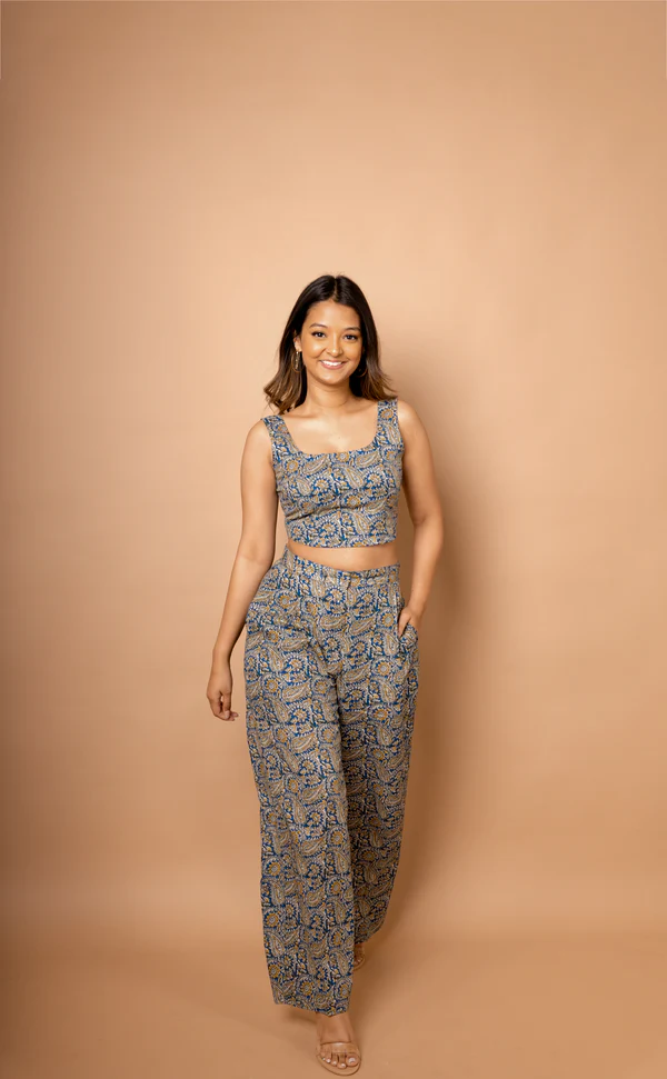 A perfect blend of the traditional and the modern, this light blue paisley printed Co-ord set with relaxed high-waist trousers and a corset-style crop top that can be cinched at the back is a chic and versatile choice for the modern woman whose day doesn’t end at the 9-5. It is well suited as a coordinated day look as well as can be mixed with other pieces to create unique and exciting outfits.